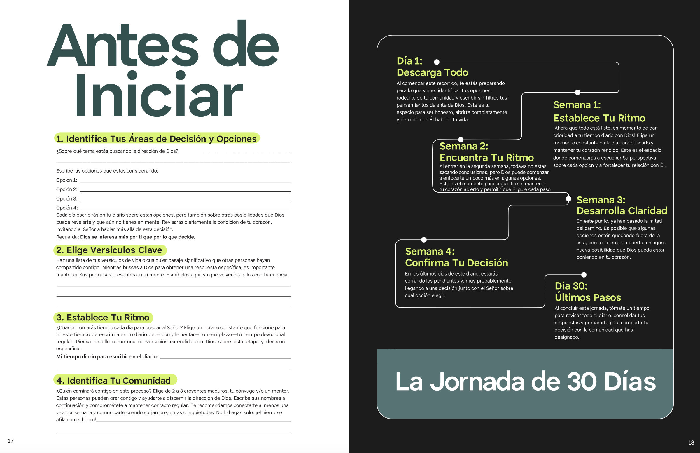 Esta experiencia de 30 días está diseñada para ayudarte a responder esa pregunta — no con suposiciones ni esfuerzos propios, sino cultivando ritmos diarios de escuchar la voz de Dios, escribir en tu diario Sus palabras y fortalecer la confianza en las decisiones que tomas.